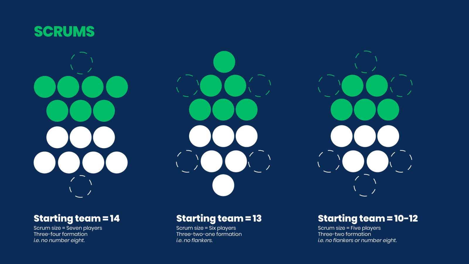 This can be agreed on by teams. The minimum scrum size is five. If no agreement, the following pack sizes will apply (adapted from U19 Law Variations):