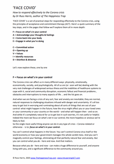 ‘FACE COVID’ is a set of practical steps for responding effectively to the Corona crisis, using the principles of acceptance and commitment therapy (ACT). Here’s a quick summary of the key steps, and in this document you can explore them all in more depth: